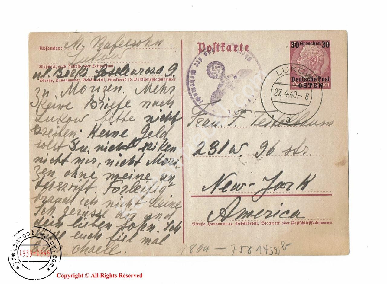 א איד פון די בערקע יאסעלעוויטש גאס אין לוקאוו, נאצי-פולין, שרייבט א פאסט קארטע צו זיין שוועסטער, 'פרוי פ. טייטלבוים', אין מאנהעטן, ניו יארק.