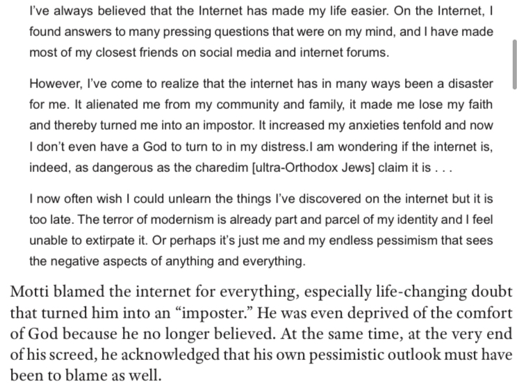 ערשטנס, דו שרייבסט אז דו ביזט אויפגעקלערט געווארן פונעם אינטערנעט, און די אויפגעקלערטקייט לכתחילה ארויפצוגיין אויפ'ן אינטערנעט האסטו אויך באקומען פון די אינטערנעט? כ'מיין וועמען נארסטו דא? וויפיל אידן קען איך וואס זענען אנגעקלערט געווארן נאך פאר די גוגל הדור איז געווארן רשכבה"ג, און וויפיל תמימות'דיגע בחורים און מיידלעך קען איך פון קרייזן וואו סמארטפאונס איז א נייטראלע אייטעם און זיי ווייסן ניטאמאל מיט וואסערע מכשול זיי דרייען זיך ארום אין טאש. ס'נישט אז די אינטערנעט מאכט אויפגעקלערט, פארקערט, אויפגעקלערטע מענטשן גייען אויפ'ן אינטערנעט, גענוג מיט די בולקרעפ, שוין.