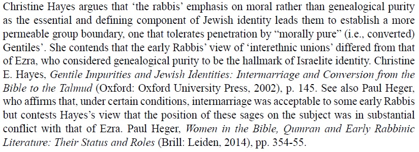 ***The rabbis seem eager to disassociate themselves from Ezran holy seed rhetoric and related Second Temple traditions that denounced even casual interethnic unions as capital crimes, subject to the vengeance of zealots. They rule that those who read a universal prohibition of intermarriage into the Bible are to be severely suppressed (M. Megillah 4:9). The rabbis failure to take up Ezra's ban on foreign wives and their children - indeed, their very reversal of this program by allowing conversion - is all the more remarkable in light of the rabbis' general perception and presentation of themselves as Ezra's (indirect) successors