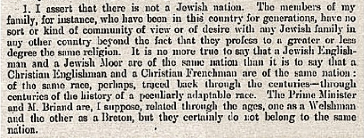 דאס איז פון וואס עדווין מאנטעגוּ, א איד וועלכער איז געווען א מעמבּער אינעם בּריטישן רעגירונג, האט געשריבן צום בּריטישן פּארליעמענט אין 1917 אין רעאקציע צום בּאַלפאָר דעקלעראציע: