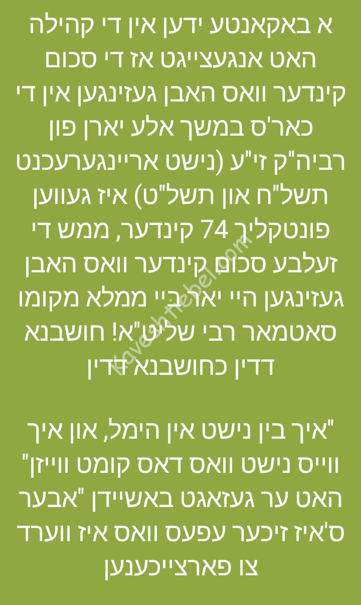 חלק קטן האט געשריבן:יעדער ווער עס האט א מח בקדקו ווייסט אז עס איז דא א חילוק משמים לארץ פון די ווינד וואס קהלות מהר"א מאכט צו קומען אויף יום טוב וואו קהלות מהרז"ל! איך קען עס דא שטיין און מסביר זיין א גאנצע נאכט, אבער נאר דער וואס איז אויפגעוואקסען און ווילאמסבורג ביי די זאלי היפעקראטען וועט פארשטיין וואס איך שרייבט....... יעדער ווייסט פאר אנדערהאלבן יאר צוריק האט זיך די רבי פון קרית יואל צעשלאגן מיט זיין נעפיו פון בני ברק. נישט קיין חילוק וואס יעדער ארוני האט געהאלטן צו די רבי איז גערעכט צו נישט. האט עס אבער געמיינט אים אדער האט מען זיך פארשטעקט פאר בושה אדער איז מען געגאנגען שטאלץ אז די רבי איז גערעכט אבער יעדער איינציגסטער בלי יוצא מן הכלל האט עס געמיינט אים זיין קהלה זיין רבי יעדער איינער מיט די זעלבע לשון עס איז מיין פלאץ איך מוז עס עסן סיי ווען די פלאץ ברענגט כבוד און סיי ווען עס ברענגט בזיונות...... מה שאין כן די שר האפיקראטען בדורינו די זאליס אוי די מגילה איז צו לאנג עס הייבט זיך אן ביי די רבי די הנהלת הקהילה אחרון חביב די עולם גולם דארטען, קודם די גאנצע שפראך איז דארטען די רבי מיט חיים יצחק מאנדעל איז מיר שילדיג די גאנצער וועלט ווייל איך וואלט געקענט שיקען מיין קינד און שאפראן חדר און דאס אז איך שיקט און סאטמאר איז מיר די רבי שילדיג מצות ערב פסח בוטשער הנחה אויף קעמפ ועוד ועוד וואס בחדא מחתא טרעט ער נישט אריין און ראדני וואו גרויס די יאר איז, אינטערסירט אים בכלל נישט די הצלחה פון די פלאץ נאר אים געבן און געבן אלעס פאר די שכר ווייל ער שיקט און יאו טי עי......... וועט די זאלי קומען זאגען דארפסט פארשטיין אונז זענען נישט אזוי פארנאטיש וואו די ארונים אונז גלייב מיר נישט אזוי און די רבי וואו זיי ביי אונז איז די רבי נאר פאר סערוויס. וויל ענק מגלה זיין עס האט גארנישט וואו שטארקט מען גלייבט עס האט אז די ביסט א נארמאלע מענטש ביסט און א פלאץ שטעל דיר צו די מינימום די מהלך המחשבה וואס עטס האסט קומט ריין פון היפעקראטיע זה הא! און פון די רבי און די הנהלת הקהלה וועט מען מען מוז א אנדערע מאהל אויסשמועסן, די בלוט גייט מיר ארויף און קאפ ווען איך רעדט פון זיי..... תכלית זאל יעדער אליינס כאפען פארוואס די צעטלעך פון קהלות מהרז"ל איז איין שטיק ליצנות און די צעטלעך פון קהלות מהר"א איז א נארמאלע אנשטענדיגע צעטל וואו א יעדער קהלה קדושה בישראל