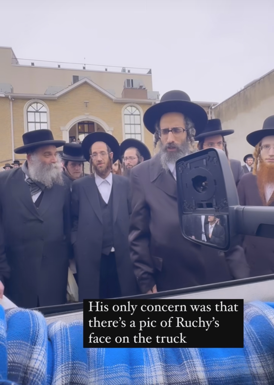 די עולם אין קרית יואל וואס האבן מיטגעהאלטן ווי א טראק פארט ארום אין שטאט פארשפרייטן עפעס א מעשה, זענען אויפגעשוידערט געווארן צו... זען א בילד פון א פרוי מיט א שפיצל אויפן טראק, און זענען געקומען מוחה זיין קעגן די געפערליכע פירצה...