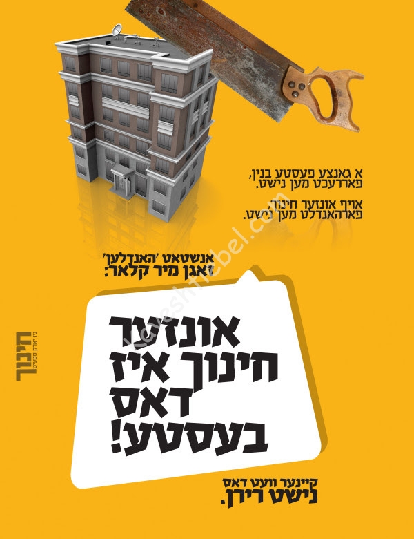 מיר וועלן זיך נישט לאזן ווארפן זאמד אין די אויגן: די ברענענדיגע טעמע פונעם חינוך הטהור פון 'אונזערע אייגענע קינדער' איז אויפ'ן טיש, און מיר וועלן נישט ערלויבן דרויסנדיגע עלעמענטן צו באשליסן דעם עתיד פונעם יהדות החרדית!