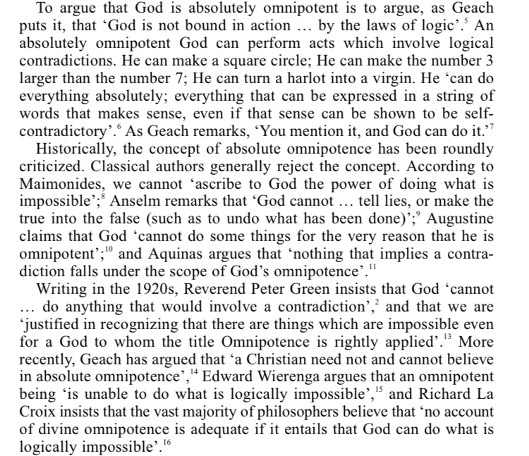 והיינו, אז גאר פארקערט: ג-ט איז נישט געבינדן צו מאראל מכח דעם אז עס איז גאר מן הנמנע פאר אים ית׳ צו זיין אימאראליש; עס איז עצמותו. דאס איז אחוץ פון דעם אז ״מאראל״ איז למעשה פונדעסטוועגן דאך אָנגעוואנדן אין אים ית׳. דאס זעלבע געדאנק קען מען זאגן לגבי חוקי הלאגיק: הגם זיי זענען בהכרח זענען זיי אבער פארט אָנגעוואנדן אין אים ית׳ און עס איז עצמותו ממחוייב המציאות.Such accounts arise from a desire to maintain the absolute supremacy of God over all there is or could be. God himself is ultimately responsible for anything that exists, and there is nothing to which God is responsible or upon which God depends. The desire to maintain these central aspects of monotheism, however, must be combined with a philosophical account of the relationship between God and whatever (other) necessary existents there are, such as (perhaps) propositions, properties, relations, and mathematical and logical truths. Most important, an account is needed of the relationship between God and morality. Here things take a turn for the worse, for some find themselves in the position of thinking that in order for God to be above all else and subject to nothing else, he must be above morality itself, perhaps above it in such a way that he does things that anyone subject to the demands of morality would not be allowed to do. A position such as that of [Pierre] Jurieu highlights in the greatest possible way the superiority of God above his creation and the conceptual distance between creator and creature